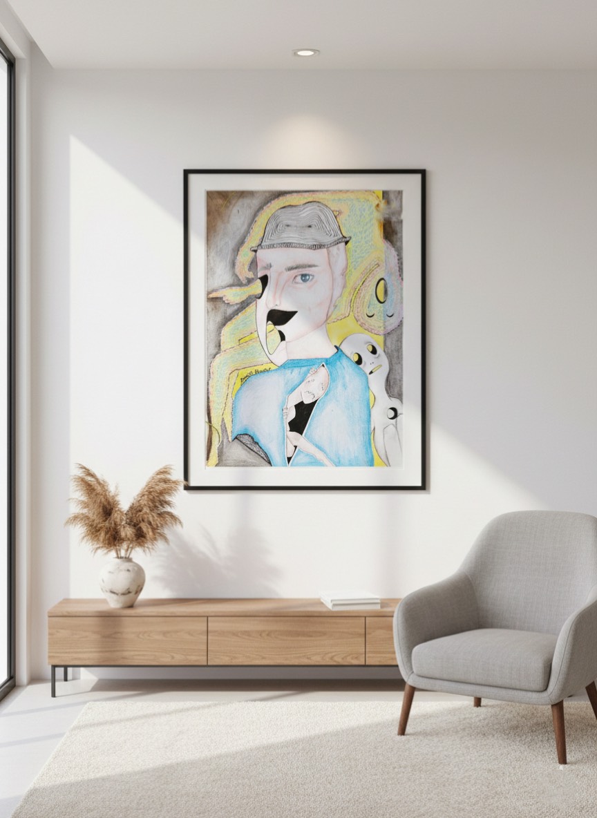 This surreal cartoon figure blends innocence and curiosity with fear and anxiety.