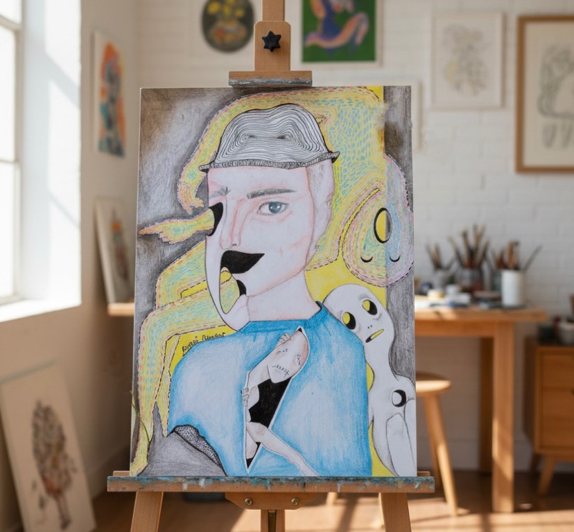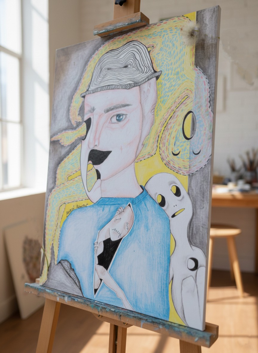 The mix of bright and muted colors creates a dreamlike, sometimes unsettling atmosphere, reflecting the fractured perception of the world and the delicate balance between imagination and inner turmoil.