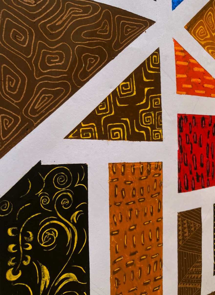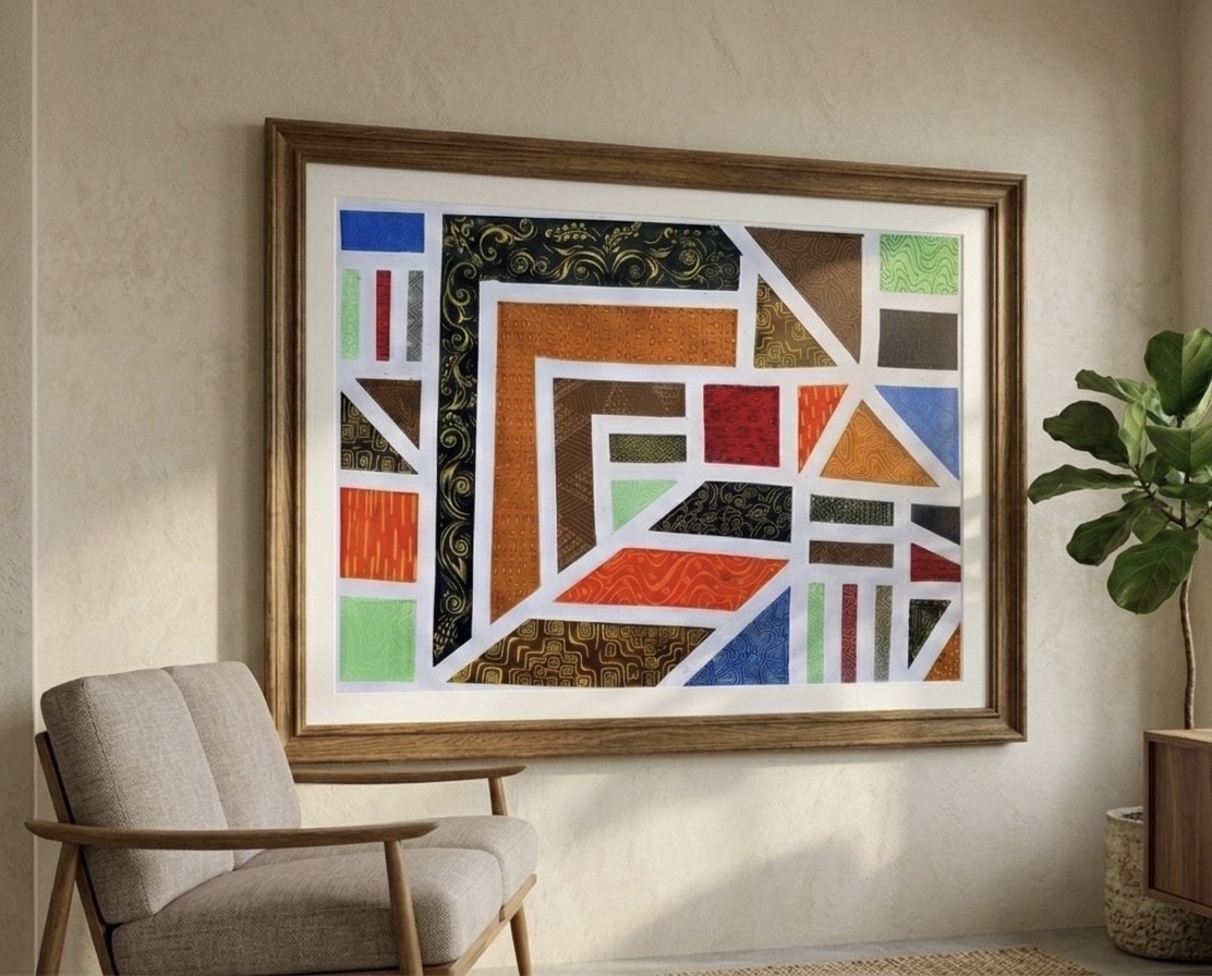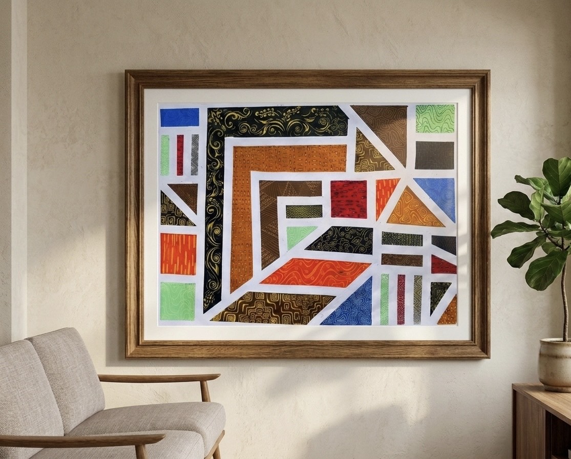 ‘Geometric Harmony’ is a geometric composition balancing rhythm and structure, where vibrant and warm colors interact with hand-drawn details to create depth and unique energy in every element.