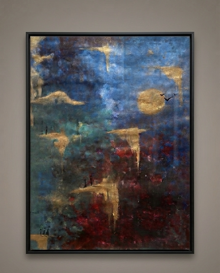 The painting reflects the philosophy of “Harmony of Chaos,” where deep color gradients blend with golden touches in a movement that is both spontaneous and deliberate. The work combines the intensity of emotions with the calm of abstraction, offering the viewer a space to contemplate beauty beyond traditional boundaries.