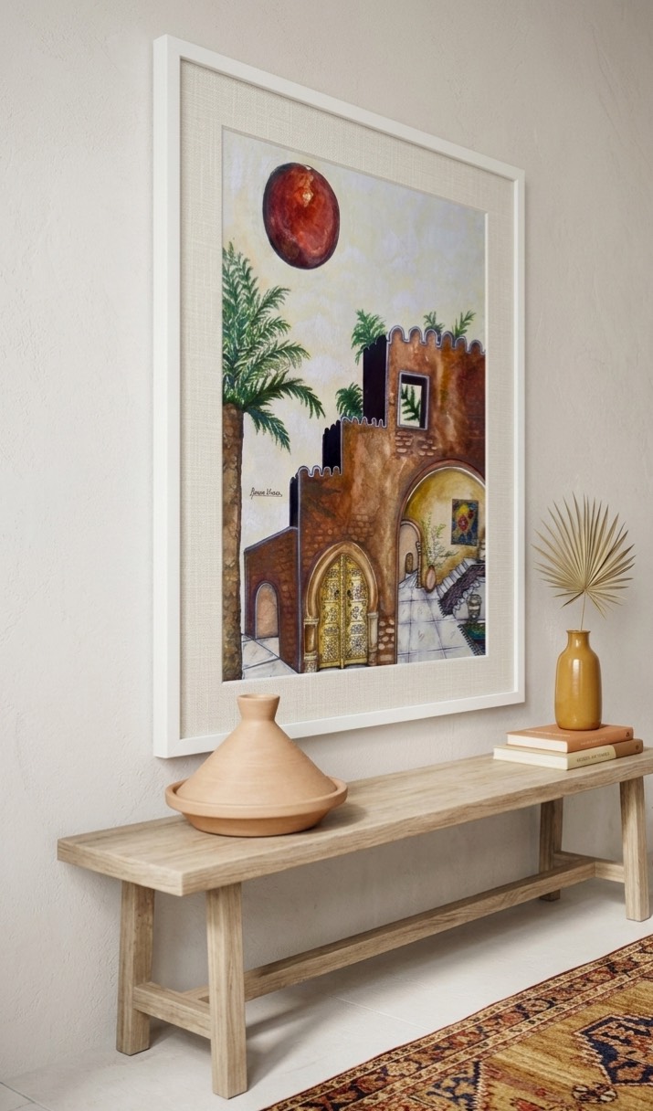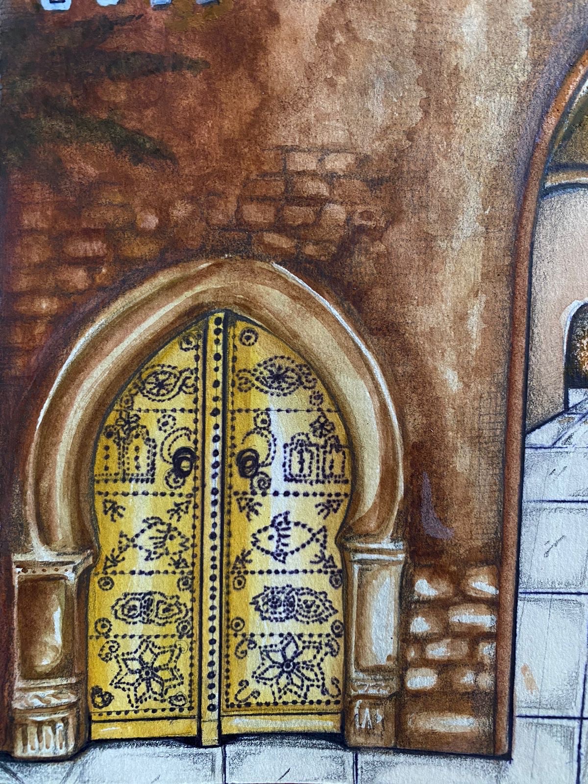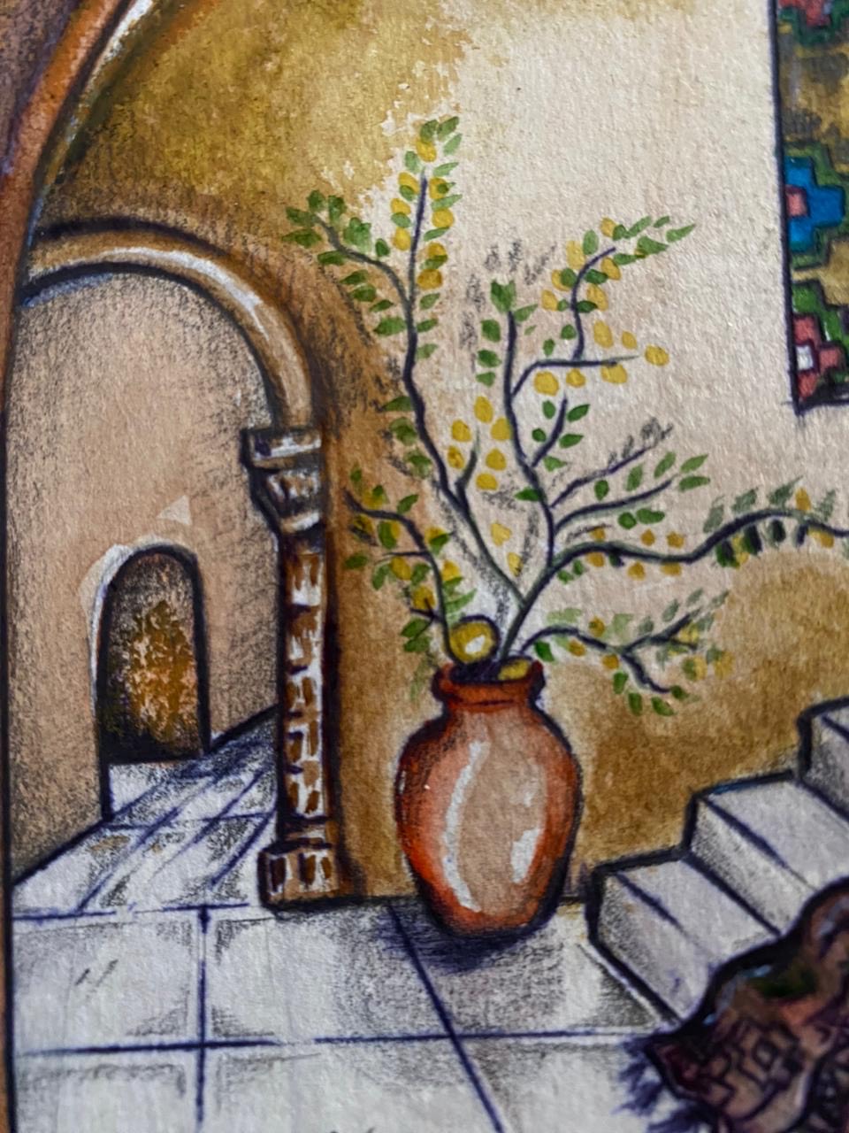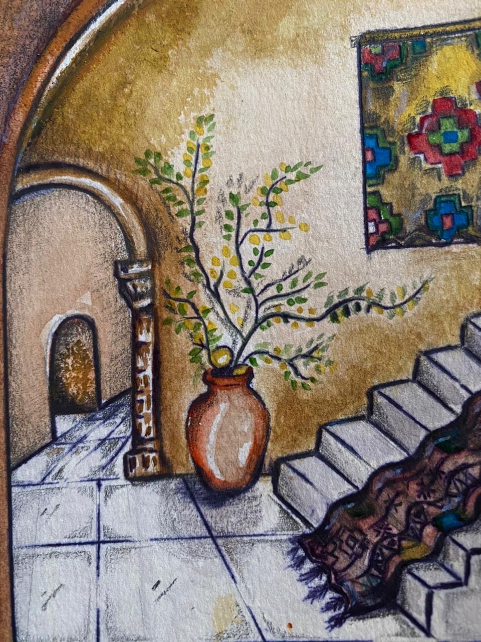 The artwork is entirely hand-painted using professional-grade watercolor, carefully layered to preserve transparency, light, and depth. Subtle pencil detailing enhances the architectural structure, creating a refined balance between softness and precision.